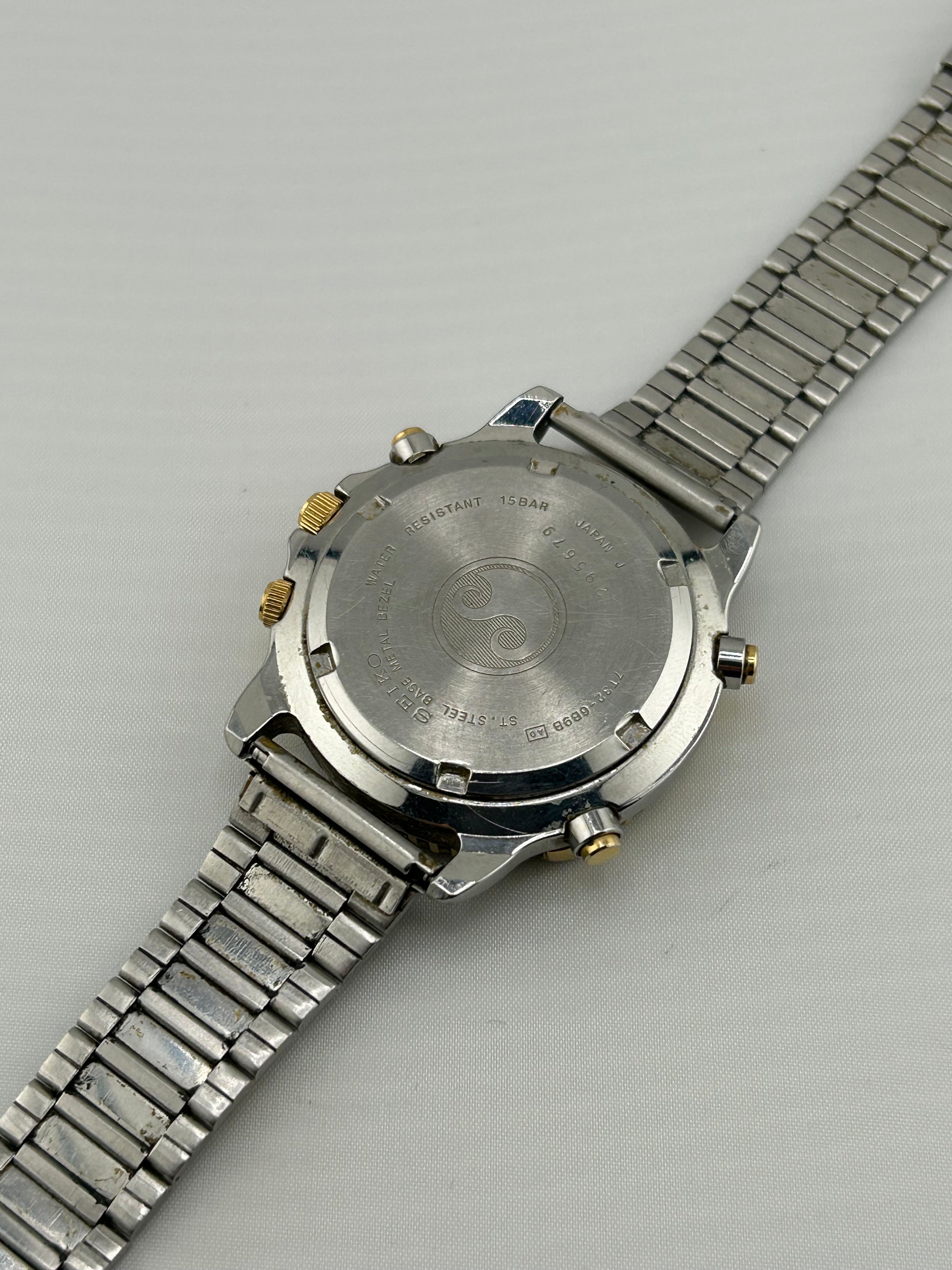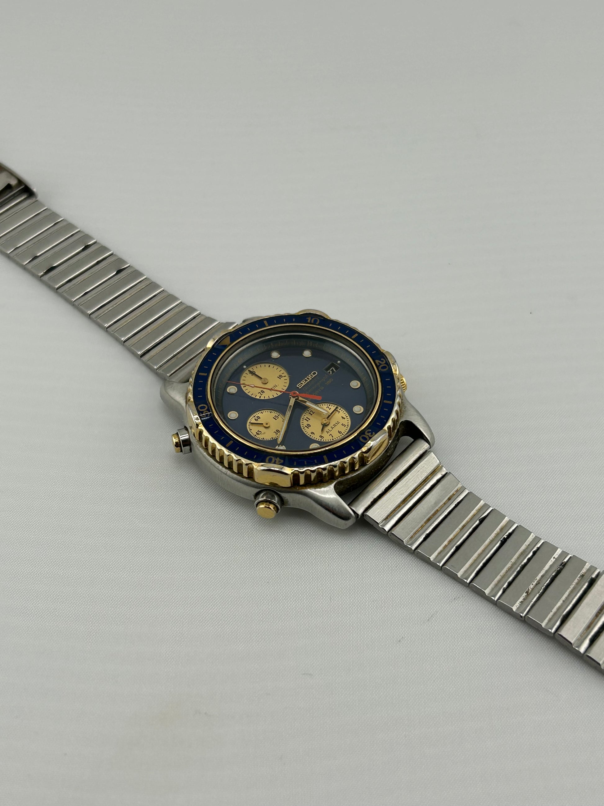 Seiko quartz alarm chronograph ref. 7T32-6D98, two-tone steel case, 150 m / 15 bar, screw-down case back, made in Japan.